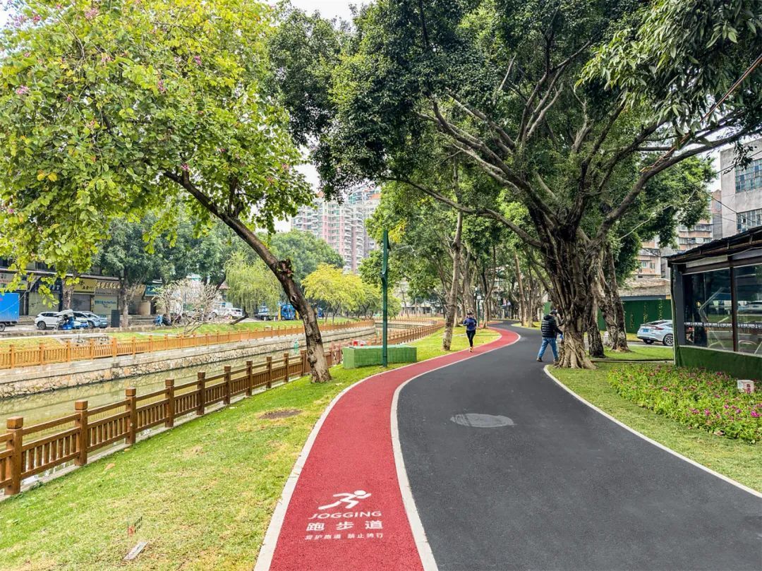 整治工程还通过合理规划漫步道、跑步道、自行车道、机动车道,形成3.54公里漫步环线和2.72公里跑步道,实现慢行系统全线贯通,滨水岸线将荔湾路、彩虹桥文化广场、周门北路、汇龙小学、澳口社区以及涌边其他社区等新旧街约、社交空间串联起来,使得河涌转变为街区连廊。