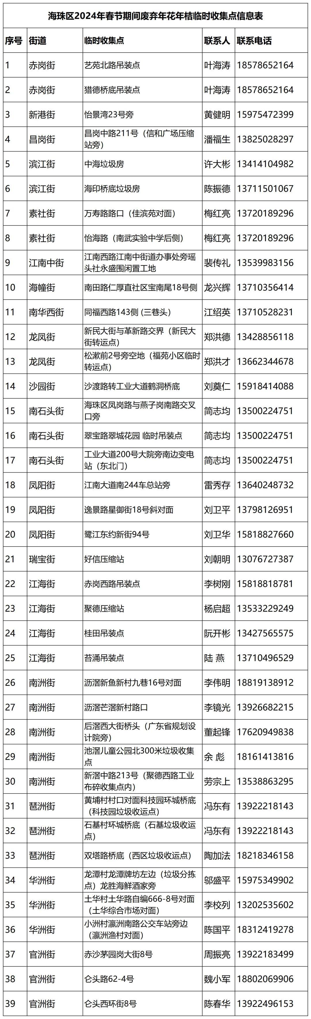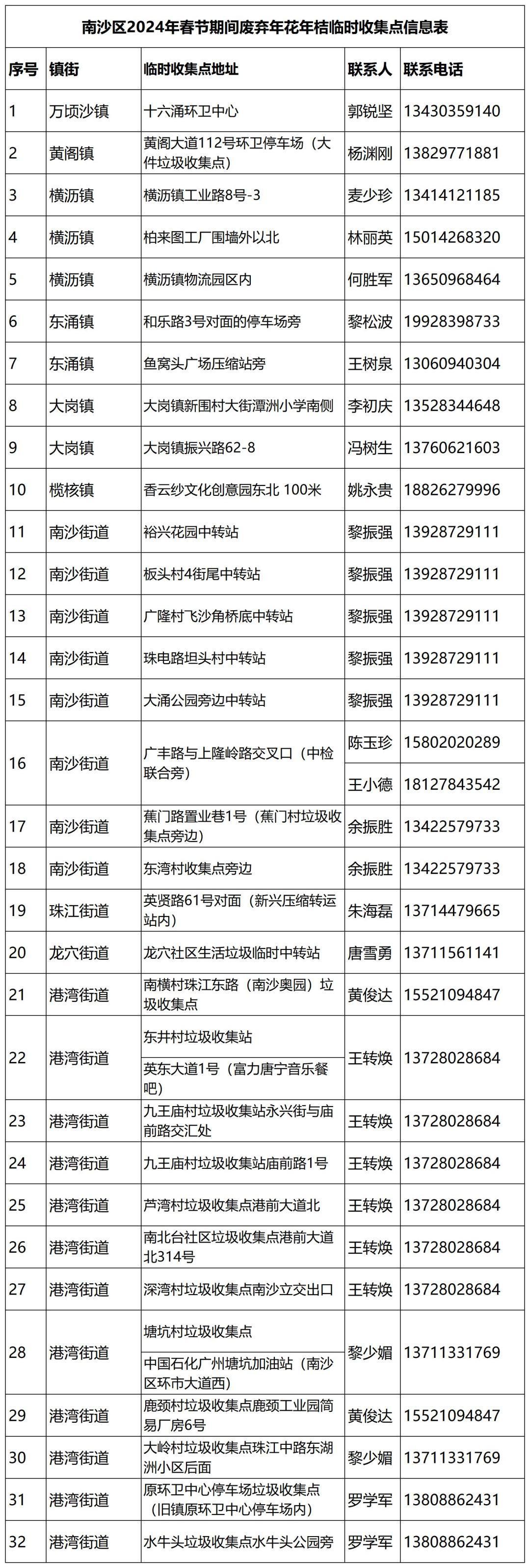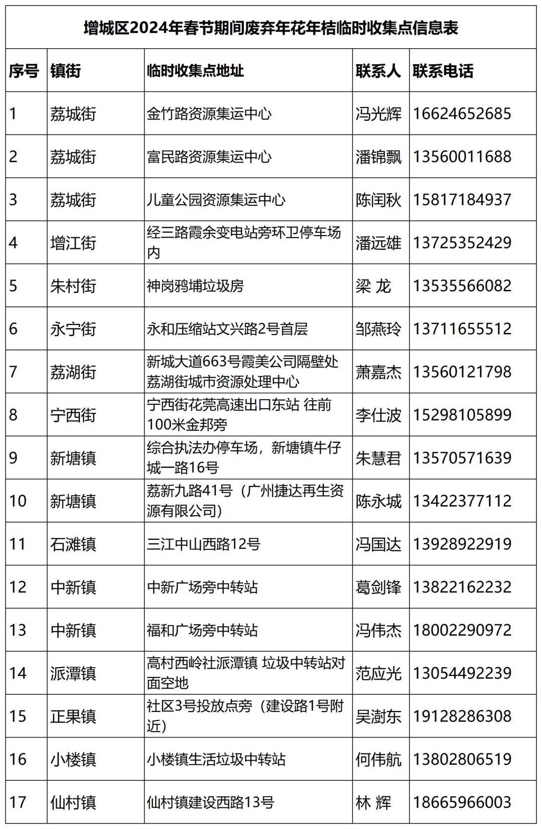 为切实做好春节期间废弃年花年桔分类处理工作,积极营造干净整洁的市容环境和生活秩序,近日,广州市政府官网公布了2024年春节期间全市744个废弃年花年桔临时收集点地址信息,并公布各收集点联系人联系方式,方便市民分类收集处置废弃年花年桔。