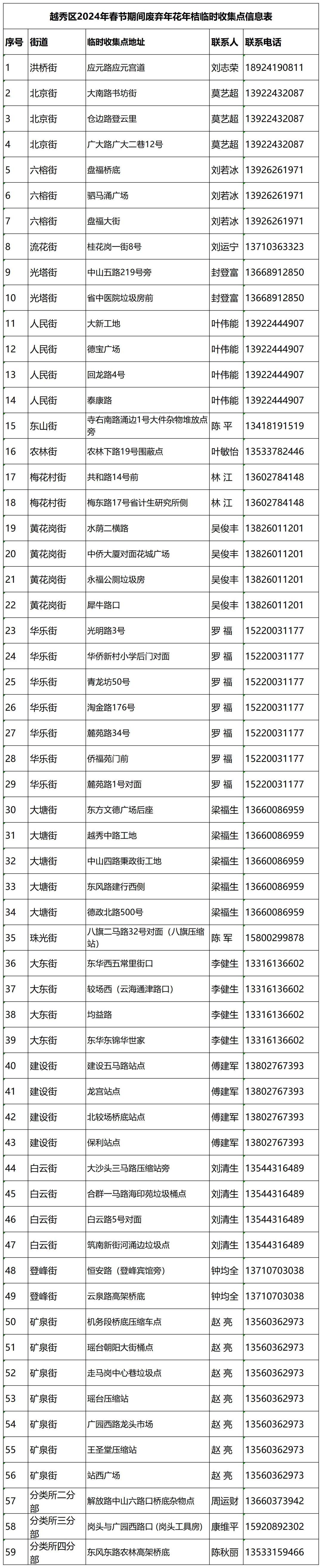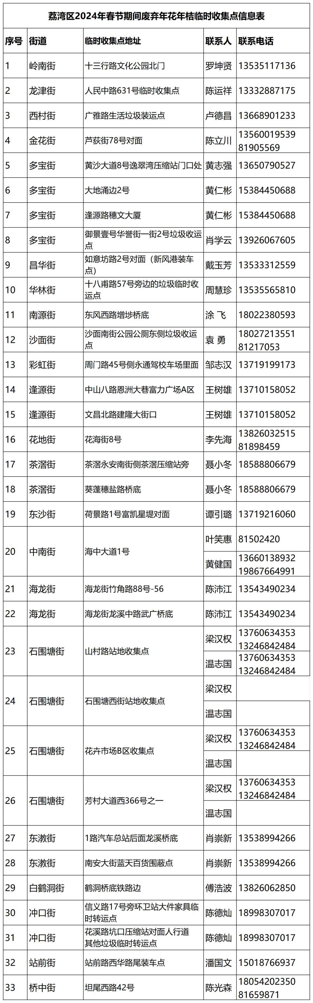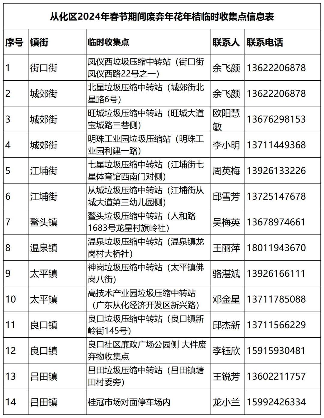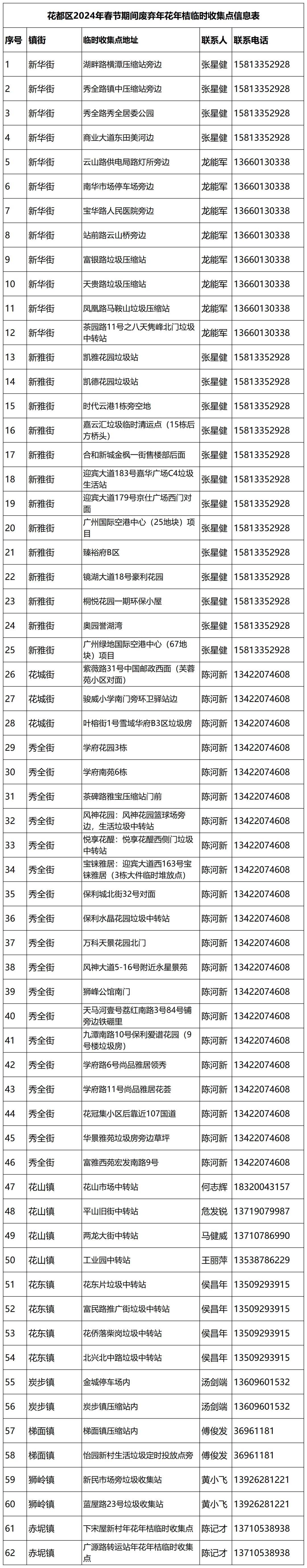 为切实做好春节期间废弃年花年桔分类处理工作,积极营造干净整洁的市容环境和生活秩序,近日,广州市政府官网公布了2024年春节期间全市744个废弃年花年桔临时收集点地址信息,并公布各收集点联系人联系方式,方便市民分类收集处置废弃年花年桔。