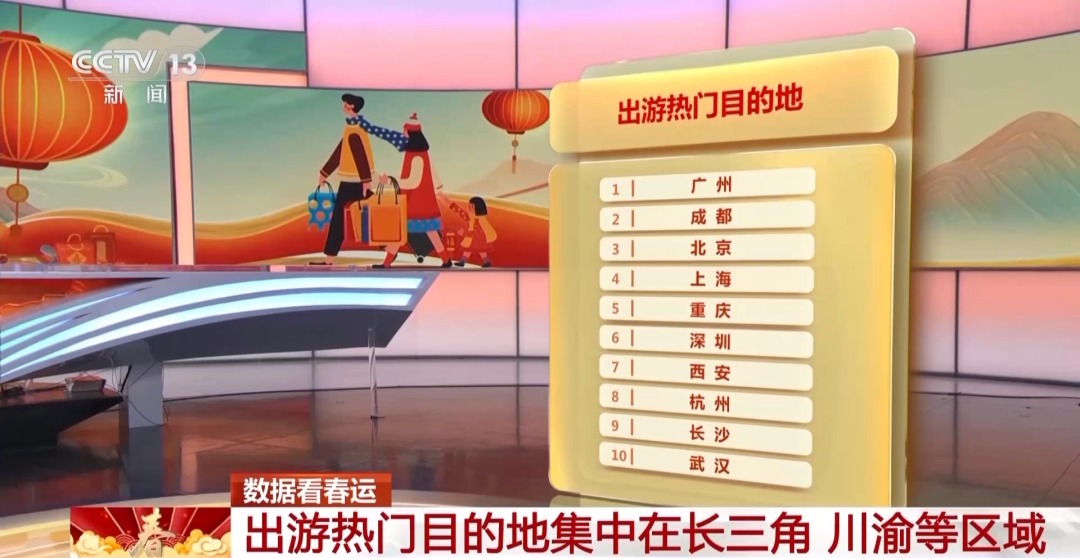 在春运期间,出去旅游的热门目的地主要集中在长三角、川渝、京津冀、大湾区,数据显示,广州是最热门的出游目的地;位于川渝地区的成都、重庆的热度提升最为明显,人文和自然景观最受欢迎。