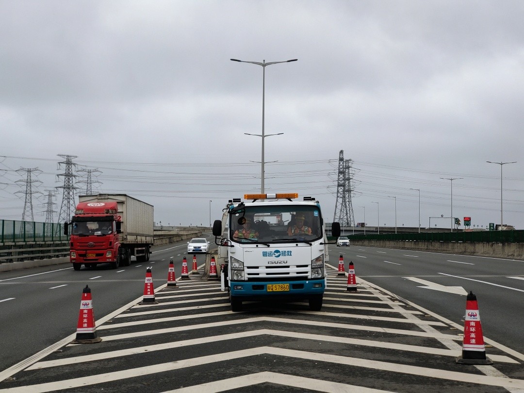 东来西往的车辆呼啸而过,车身在微微颤抖。2月7日下午,密密麻麻的雨点打在车窗上,来自广西柳州的王庆宏和广东高州的李泳,坐在清障车里,在南沙大桥桥头(黄阁)驻勤点待命。