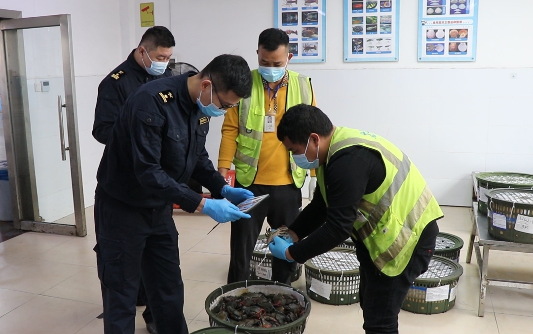 广州白云机场海关关员正在查验进口青蟹。