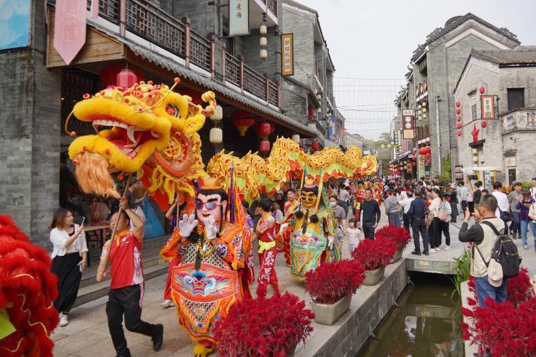 在岭南印象园,锣鼓喧天,瑞狮跃动,各种民俗活动精彩上演,传承年俗,吸引了众多市民游客参加,喜迎新年。