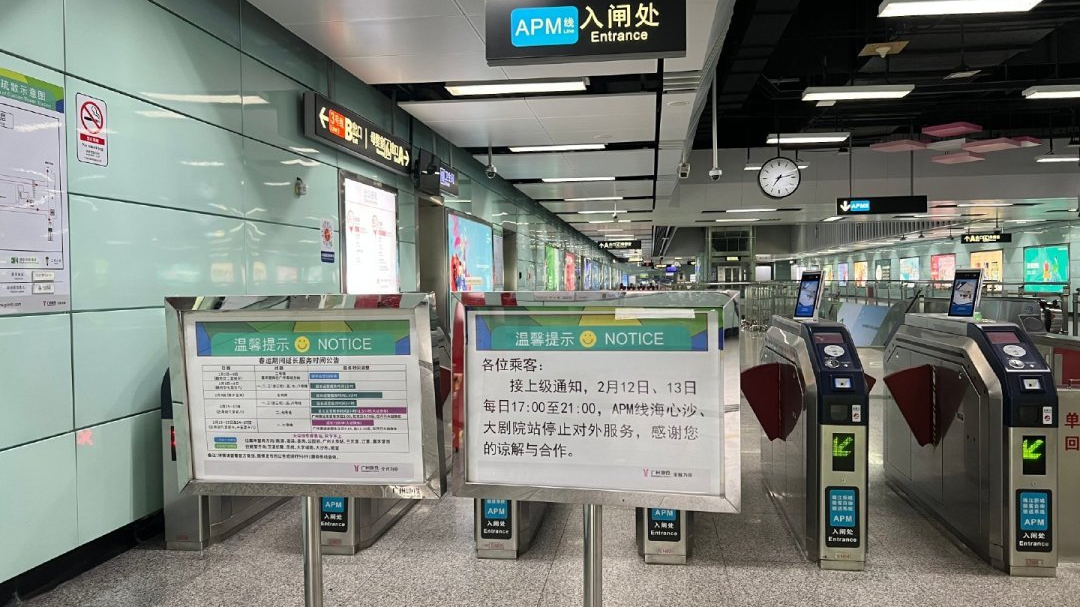 【今晚无人机表演继续,APM线海心沙、大剧院站“飞站”】为配合无人机表演活动,2月12-13日17:00至21:00,APM线海心沙站、大剧院站停止对外服务,列车不停站通过,需要前往上述两站的乘客可到邻站下车,从地面前往。查看详情>>
