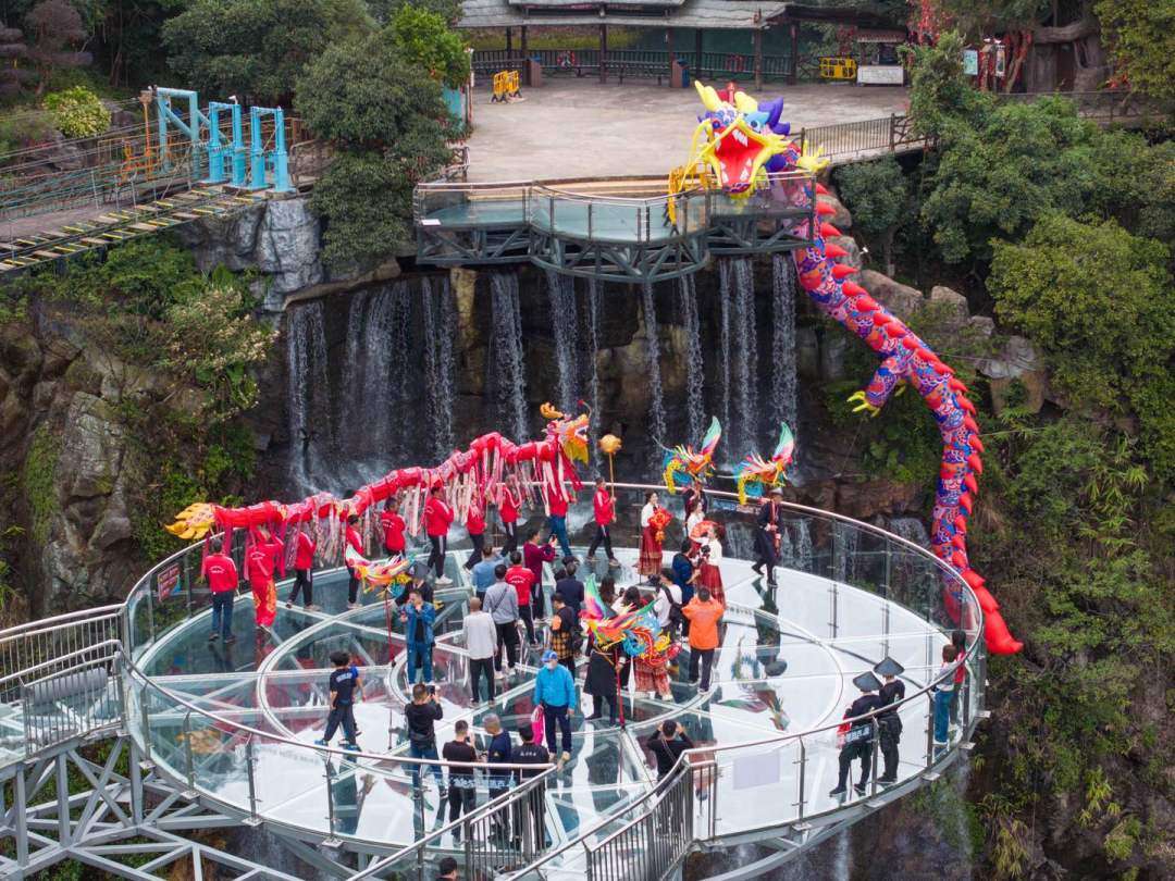 龙年新春期间,清远古龙峡将不定时举行“旺龙戏凤”的欢庆表演,市民及游客可在古龙峡一睹传统非遗的风采。数十米长的“旺龙”,由数百条“背带”组成,在悬空跨度72米,高度530米的云天玻霸观景台上亮相,与四只火凤一同起舞,展现“龙凤呈祥”的壮丽景象。旺龙,又称背带龙,是清远本土传统非遗项目。龙腰部分由各家各户的婴儿背带组成,背带上写着每家每户的美好祝愿,象征着家族人丁兴旺、生活幸福美满。