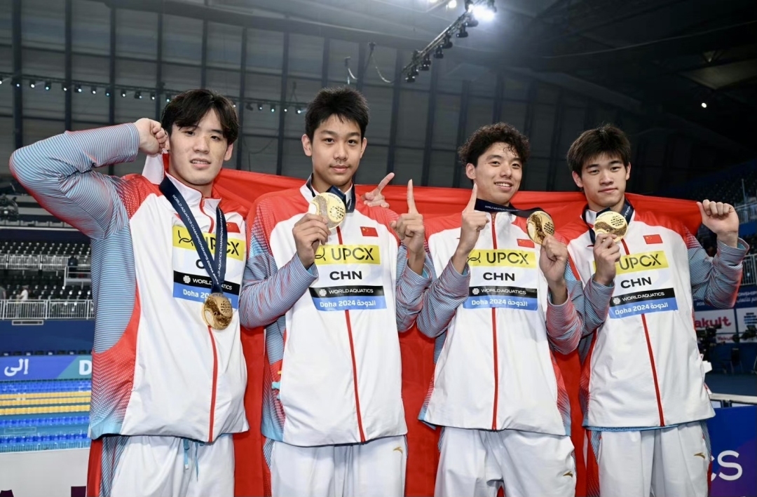 龙年大吉!中国游泳队在2024多哈世锦赛开门红,19岁的潘展乐联手季新杰/张展硕/王浩宇在男子4x100米自由泳接力决赛中夺冠,赢得了本届世锦赛中国军团的首枚游泳金牌。中国游泳队更创造历史,首次夺得该项目的世锦赛金牌,此前中国男队在世锦赛上仅获得过两枚4x200米自由泳接力铜牌和一枚4x100米混合泳接力银牌,而男子4x100米自由泳接力项目,中国队总共3次挺进该项目的世锦赛决赛,之前分别是2015年的第7名和2023年的第4名。