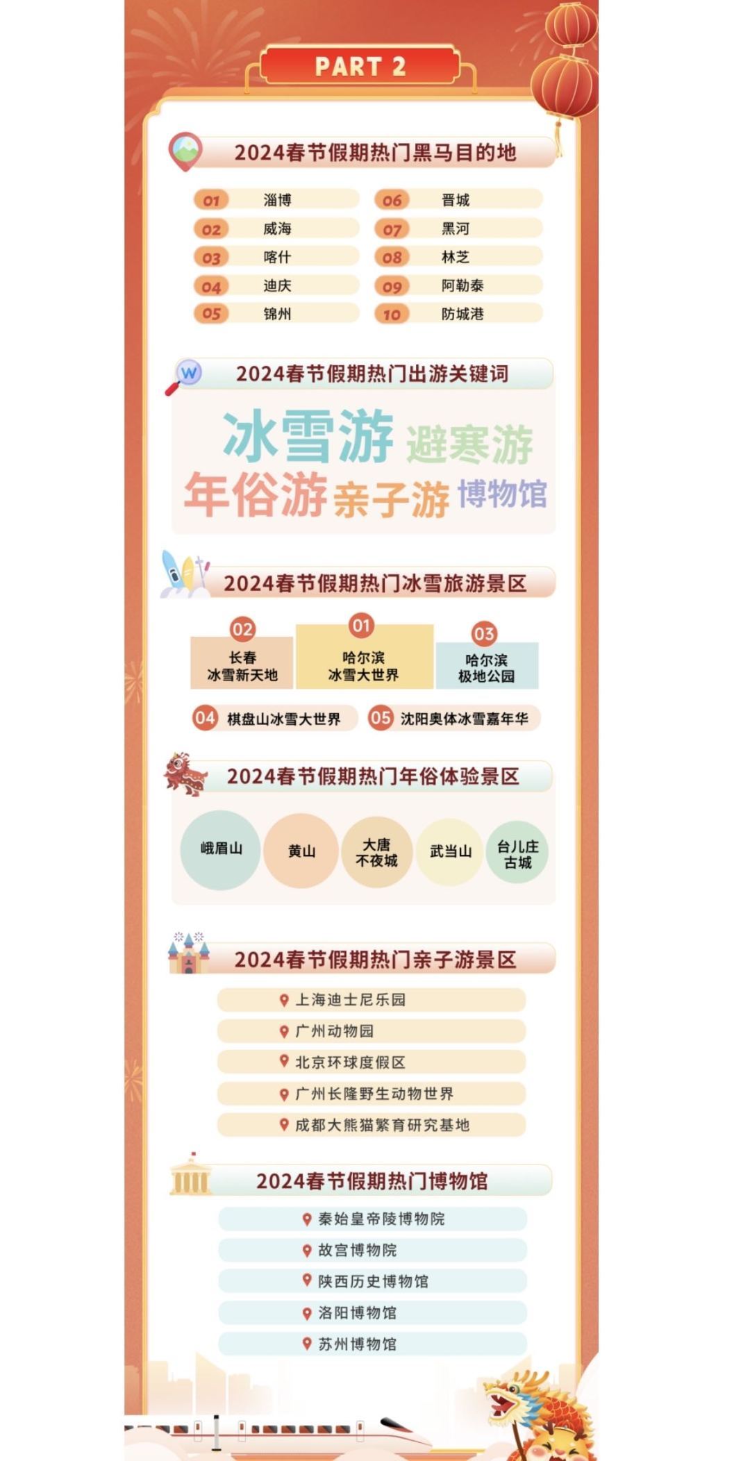 春节假期选择带娃出游的家长们,大多选择了主题乐园和动物园。上海迪士尼乐园、广州动物园、北京环球度假区等景区成为假期最热门的亲子游景区。国内各大博物馆也在春节迎来客流高峰,众多热门博物馆提前3-7天就已经约满。秦始皇帝陵博物院、故宫博物院、陕西历史博物馆、洛阳博物馆和苏州博物馆是春节假期搜索热度最高的博物馆。