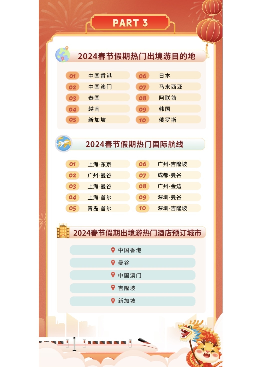 同程旅行数据显示,中国香港、中国澳门、泰国、越南、新加坡、日本、马来西亚、阿联酋、韩国、俄罗斯是2024春节最热门的出境游目的地。欧洲、非洲、南美洲等长线出境游目的地旅游热度也快速增长。