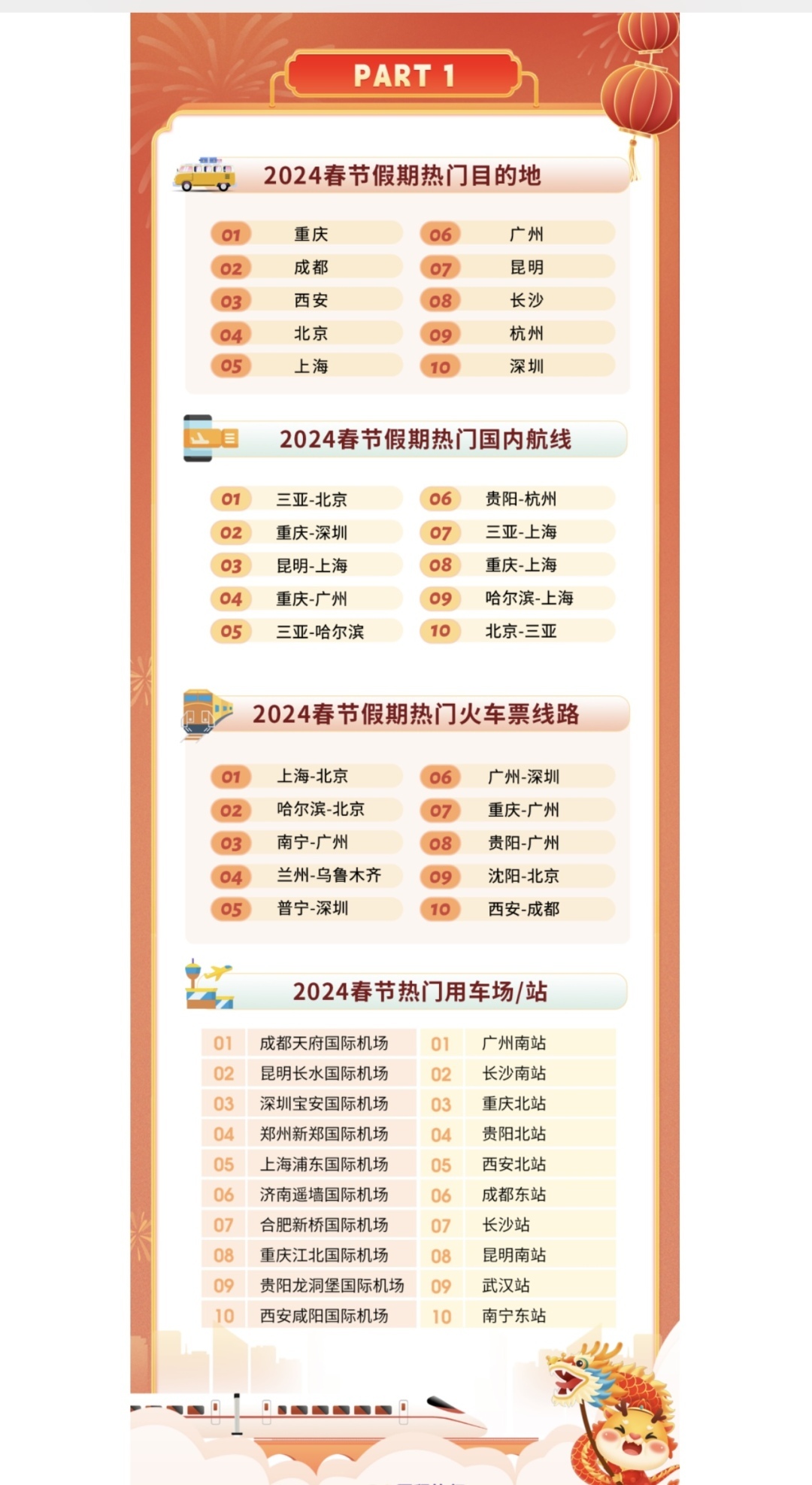 哈尔滨的冰雪旅游热度贯穿春节假期,在热门航线中,哈尔滨往返北京、上海、三亚的航线预订量大幅上涨。假期后半程,三亚前往北京、上海等核心城市的机票搜索热度快速上涨,成渝、长三角、珠三角之间的航班也较为热门。热门火车线路也集中在各大一线城市和区域核心城市之间。用车方面,成都天府国际机场是国内接送机最热门的机场,广州南站则是国内接送站最热门的火车站。