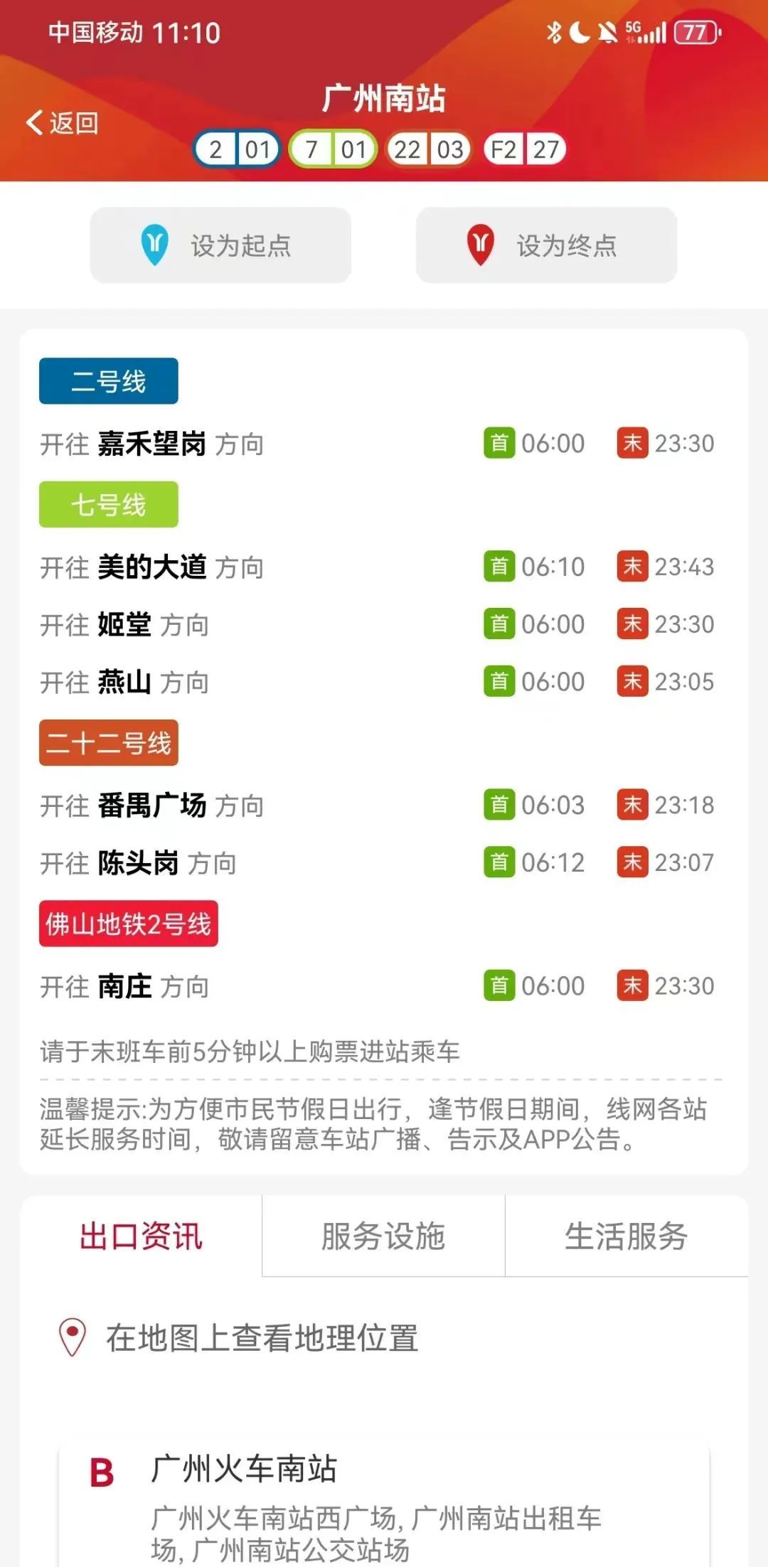 其中,二、七号线于次日0:30—2:00期间将开行从广州南站始发的夜间大站快车,二号线为广州南站至嘉禾望岗方向、七号线为广州南站至姬堂方向,中途停靠站点只下不上,广州南站末班车为次日2:00。
