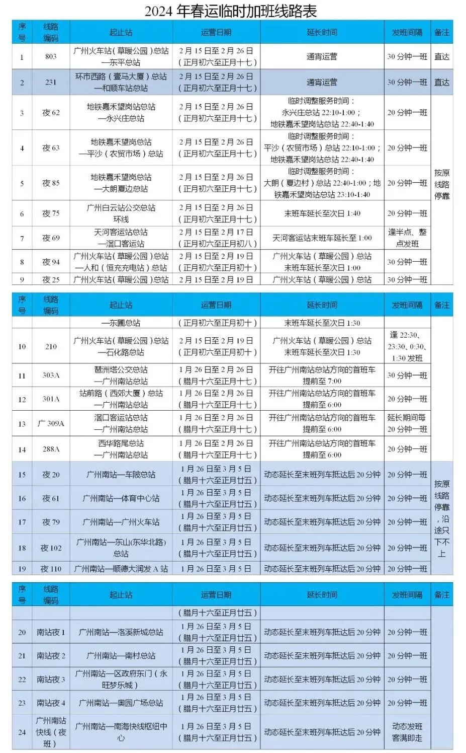 01、加强对广州火车站、广州东站、广州白云站、广州南站等交通枢纽的客流监控,加密发班班次。