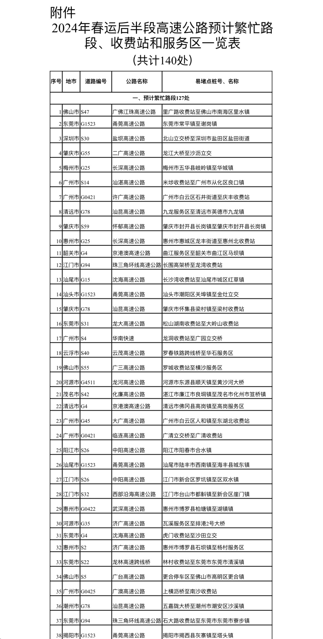 据广东省交通运输厅,预计2024年春运后半段(2月10日至3月5日),广东高速公路网累计车流量将达1.73亿车次,日均车流量约692.8万车次,同比(2023年同期686万车次)增长0.87%,同比(2019年同期532万车次)增长30.08%。