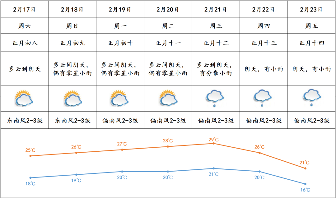 17—21日受槽前波动和低层南风脉动影响,云量增多,天气暖湿,早晚有轻雾,间中有零星小雨。