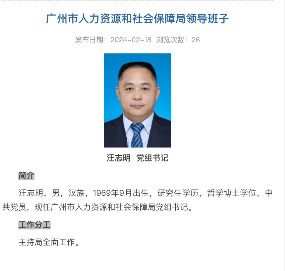 2月18日,记者从广州市人力资源和社会保障局网站获悉,汪志明已任该局党组书记。