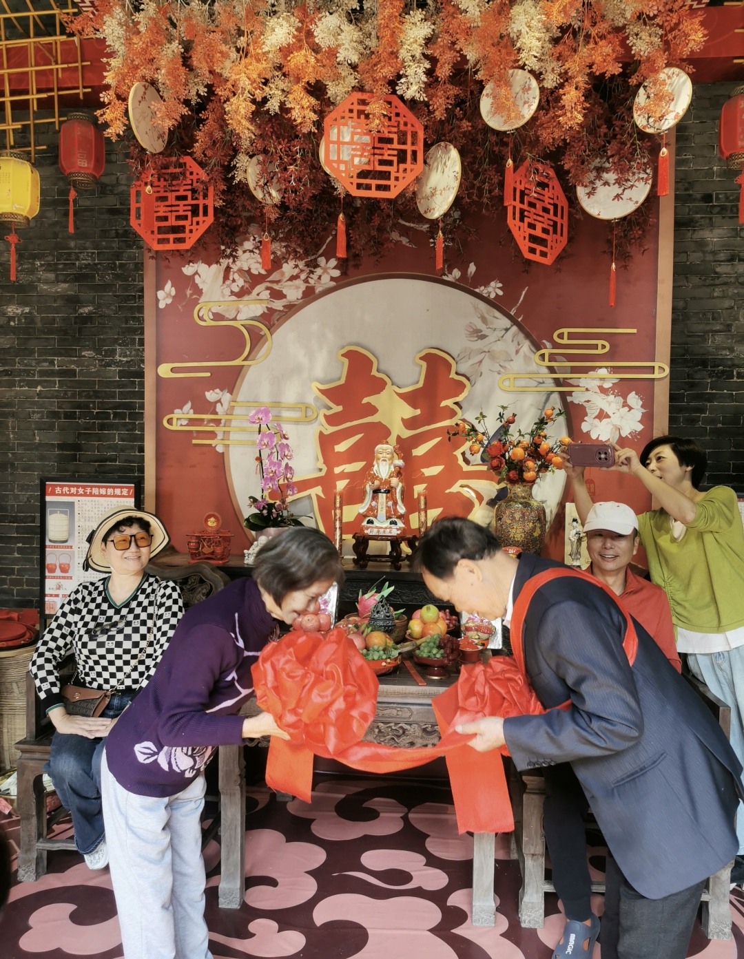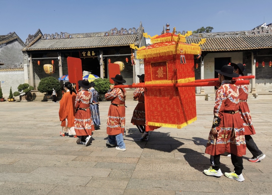 在大妗姐、子君老师和司礼官波波老师的带领下,该市民和他的太太依次进行新人登堂之礼、挑红盖头、三拜仪式之礼、合卺之礼等仪式。最后,他们在岭南囍事文化馆司礼官和大妗姐的引领下进行了花轿巡游,受到热捧。