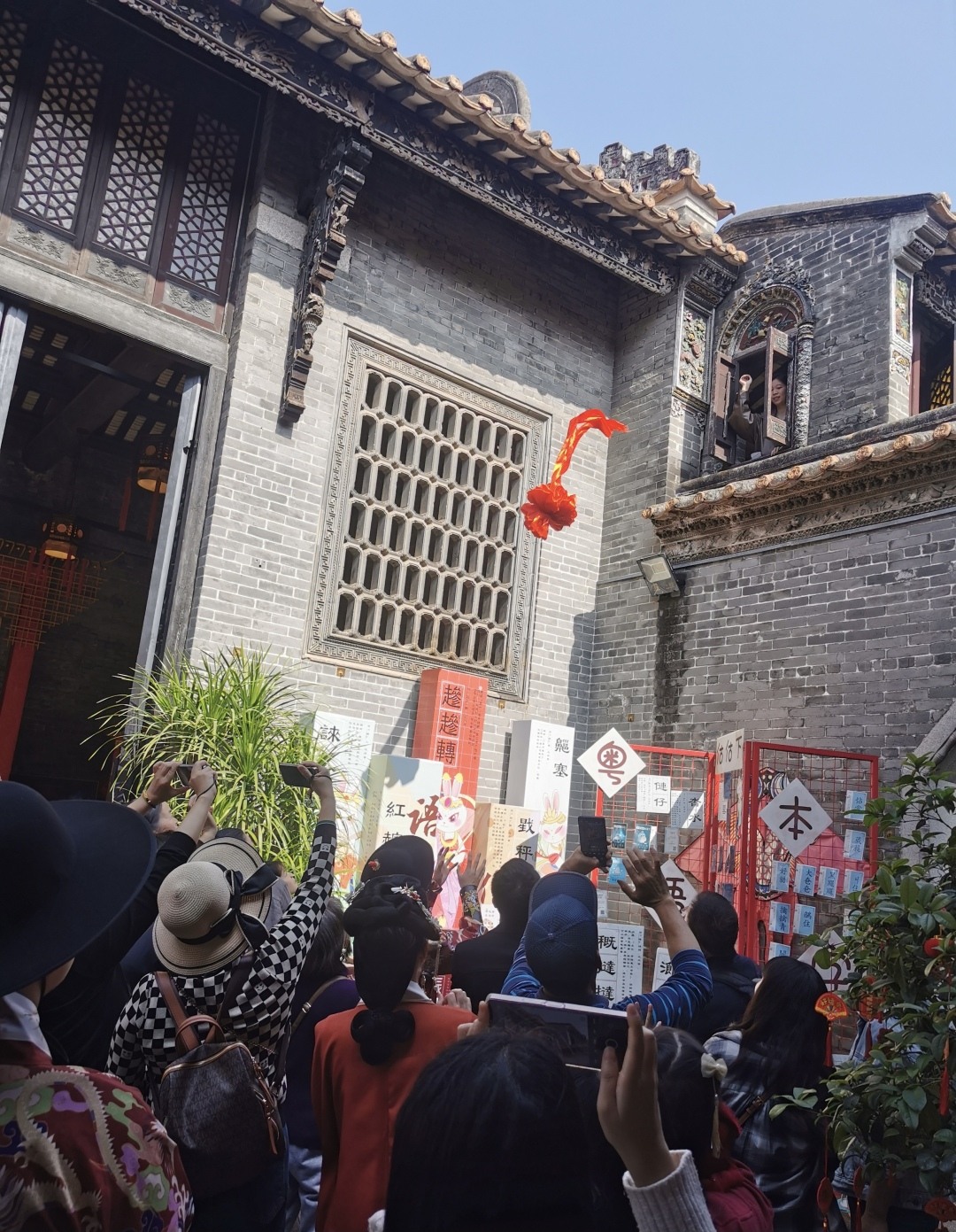 “新年溜溜有喜事!”2月14日时值2024年龙年新春佳节大年初五,广州市番禺区沙湾古镇岭南囍事文化馆的抛绣球体验活动引得游人如织。