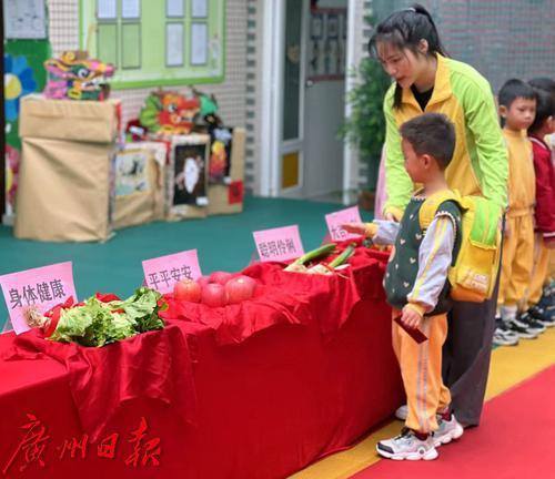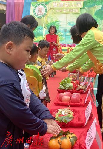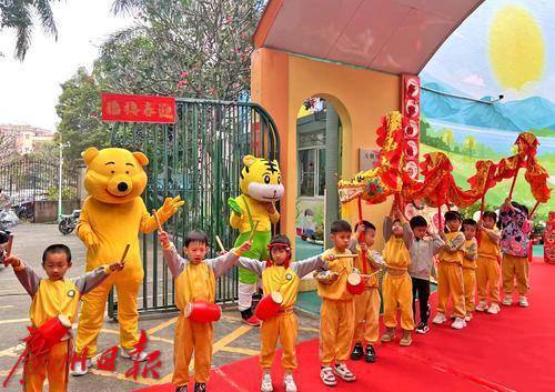 记者见到园内新年的气氛浓烈,有成排的红对联,有鼓乐表演,有舞龙舞狮,小朋友们还能收到老师给的小红包,最有意思的是小朋友走进学校可以摸摸苹果、桔子、生菜和大葱,意为平平安安、大吉大利、身体健康和聪明伶俐,还有由大人扮成的虎、熊、羊、猫等大卡通大公仔迎接孩子们。