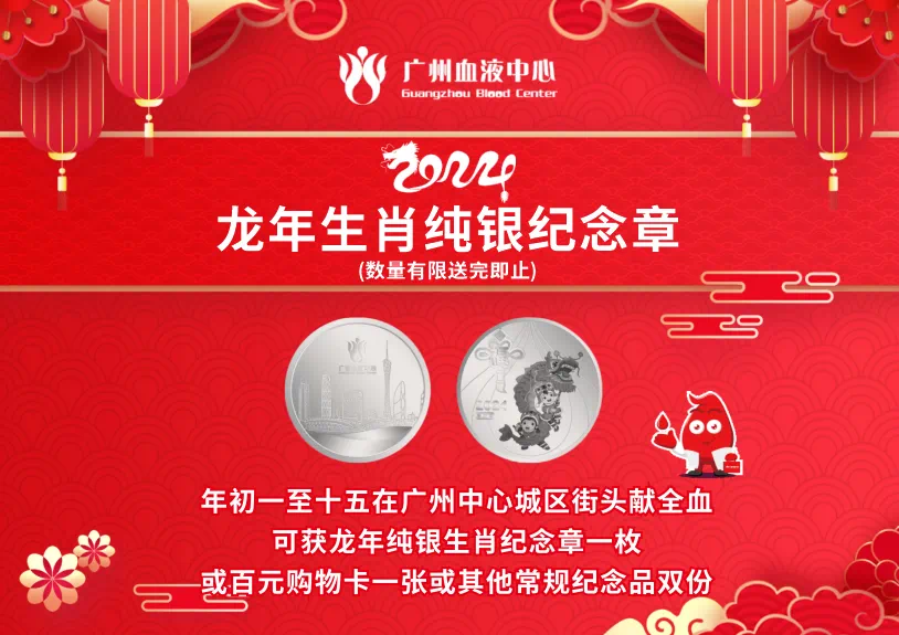 据了解,年初一至十五在广州中心城区街头献全血可获龙年纯银纪念章一枚或百元购物卡一张或常规纪念品两份,其中龙年纯银纪念章数量有限,先到先得,派完为止(活动不含番禺、花都、从化和增城区)。