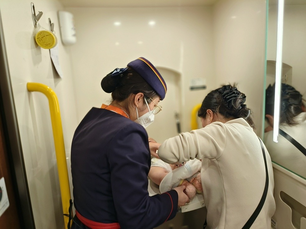 “您扶好宝宝,我帮您用湿巾把宝宝屁股擦干净。”吴怡熟练地帮周女士给小孩换好尿不湿,又领着她们回到座位上。