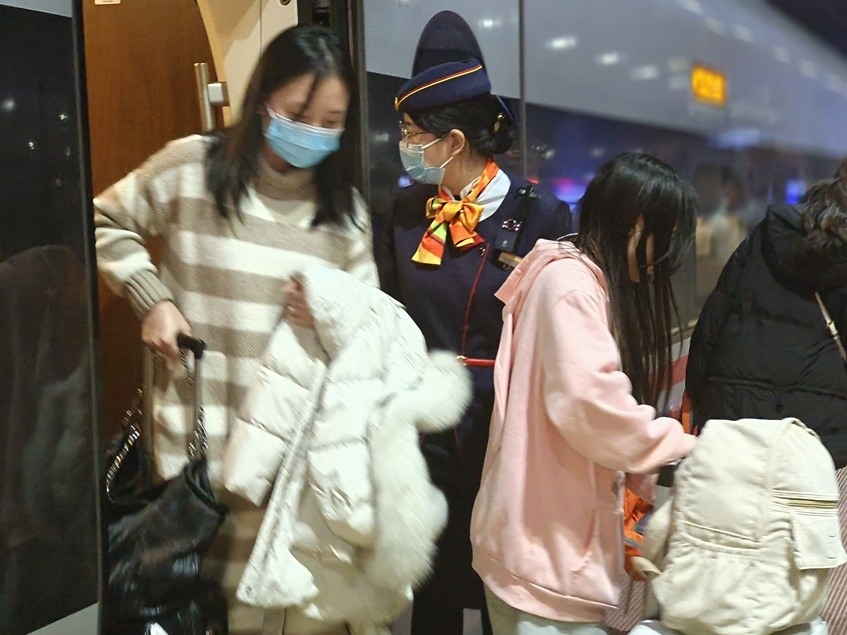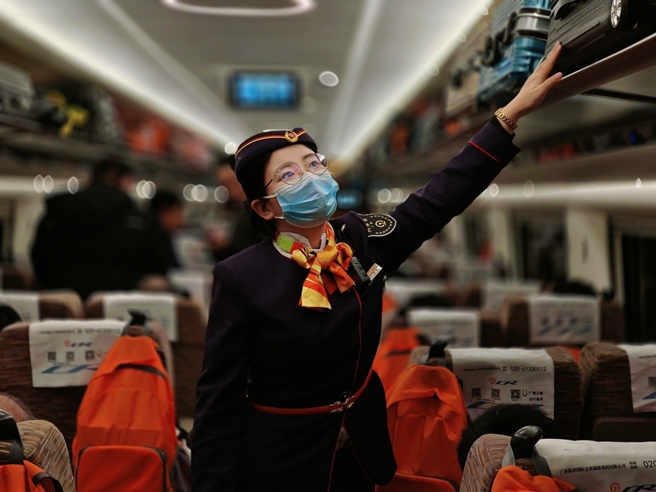 19时04分,列车到达广州南站。吴怡和同事们提前逐个车厢提醒旅客看好孩子、拿齐行李,护送着乡亲们走出车厢。