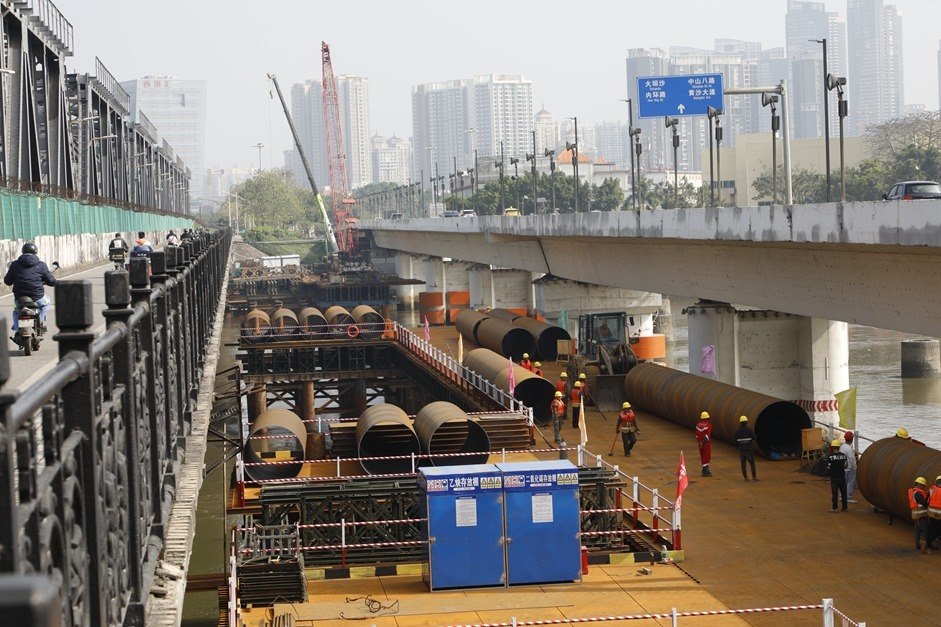 龙年新春,荔湾区石围塘附近的珠江江面上,广湛高铁广州至佛山段珠江四线特大桥水面施工正紧锣密鼓进行,建设者们忙着搭建施工平台,为水中桩基施工做准备。