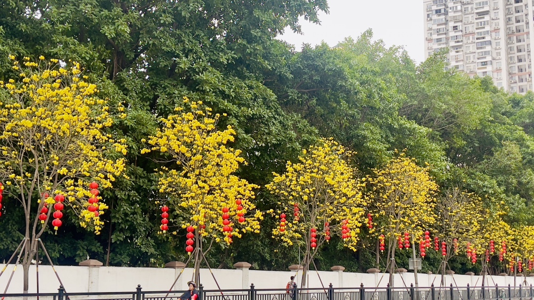 相对于去年而言,今年由于气候原因,黄花风铃木提早了近半个月进入盛花期,在新春佳节的氛围烘托下显得格外喜庆。无论是环岛路的洲头咀公园,还是东晓南路晓港公园附近,都吸引不少市民游客前来拍照打卡。