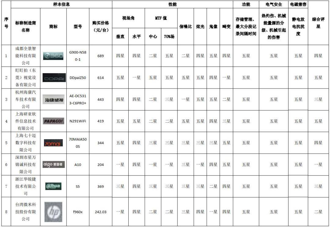 广州市消委会行车记录仪商品比较试验结果一览表