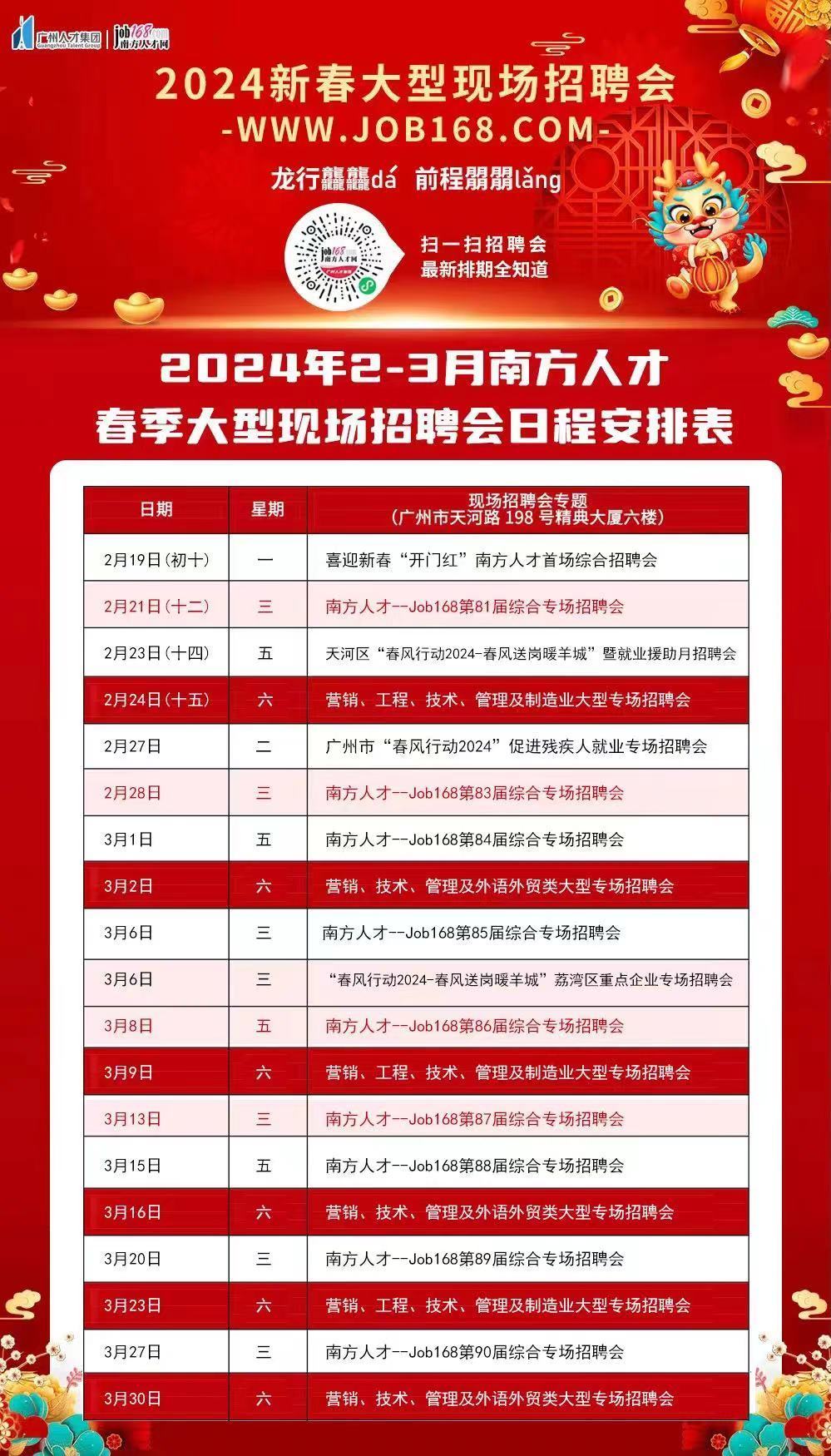 据悉,2~3月,配置中心将持续举办20余场现场招聘会,其中包括南方人才—Job168综合专场系列招聘会、“春风行动2024”系列招聘会等,有意参会的企业和求职者可关注相关日程安排。