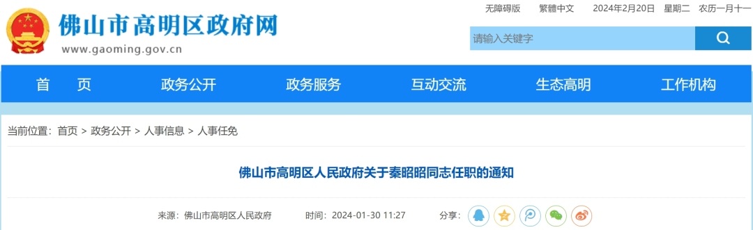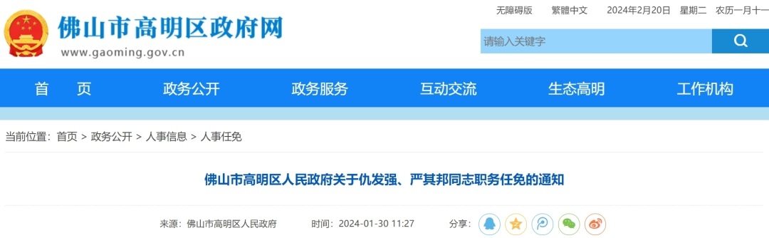 近日,佛山市高明区人民政府官网发布人事任免通知。