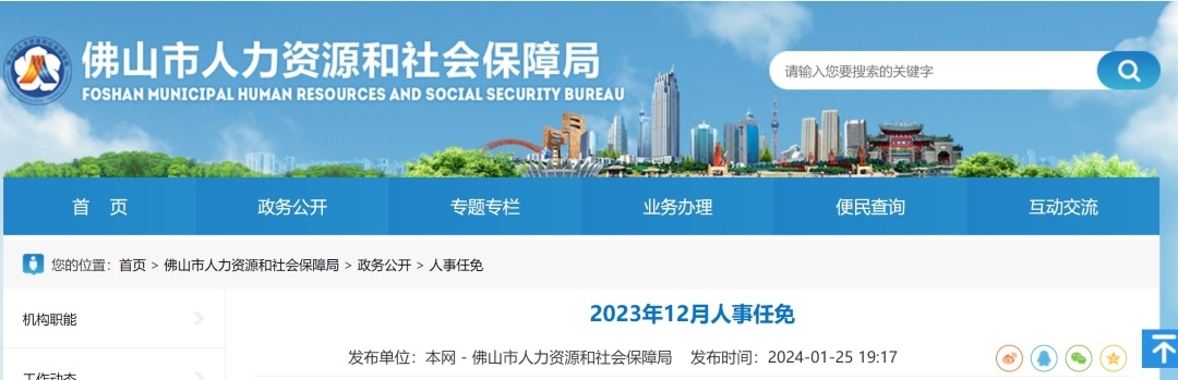 近日,佛山市人力资源和社会保障局发布最新人事任免。