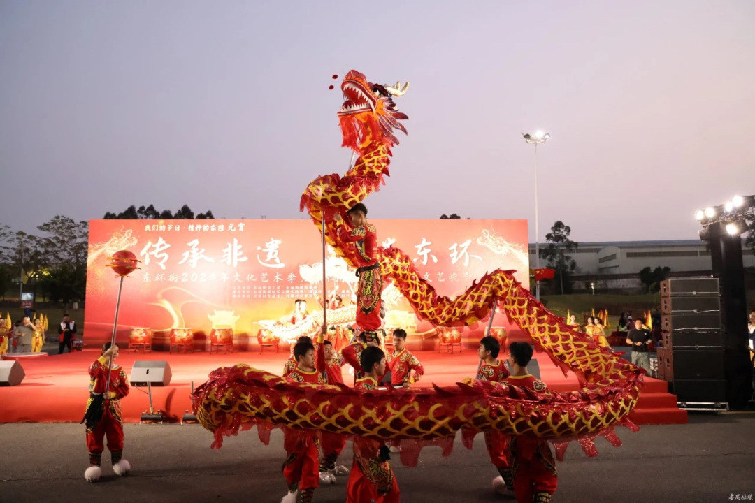 当晚村内筵开千席,宴请亲朋好友。1.2万余名群众朋友有序落座,两条金龙从两侧登上舞台中央,由蔡边精成龙狮凤体育总会的舞龙节目《龙腾珠水庆民安》为东环街2024年文化艺术季启动仪式暨新春群众文艺晚会正式拉开序幕。出席的区领导和街主要领导在热烈掌声中上台为东环街本年度的文化艺术季举行启动仪式。随后轮番上演的群体舞蹈《鼓舞飞扬》、粤剧折子戏《花好月圆》、歌舞《祝福你》等一系列群众文化节目为在场的朋友献上了一场喜庆欢乐的文艺盛宴。