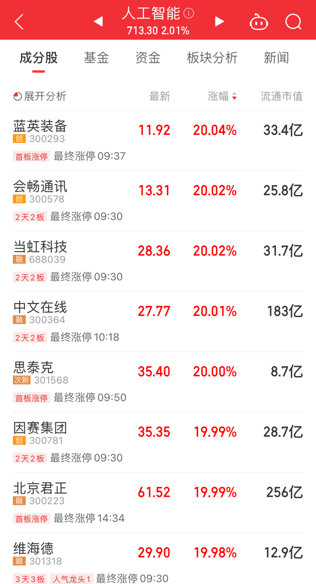 2月20日,受Sora、文生视频等AI话题影响,相关概念股持续走强。截至当日收盘,当虹科技、因赛集团、中文在线等涨停。据同花顺App显示,人工智能板块涨2.01%。