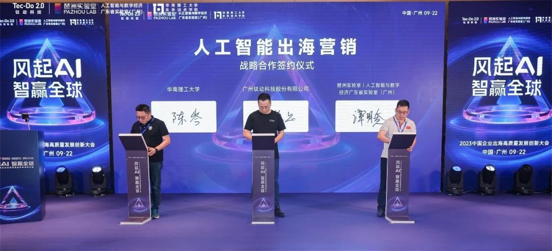 AI技术正在颠覆想象,产业创新发展需要多主体的有机融合。钛动科技坚持创新理论与实践范式齐头并进,于2023年与广东省琶洲实验室、华南理工大学达成产学研三方战略合作。钛动科技基于成功帮助超过30000家中国品牌扬帆海外的丰富经验,拥有在全覆盖时代打下的大数据底座和深厚的业务实践探索,产学研三方合力,深入AI应用的深水区,推动钛动产品迭代升级,更有力地推动中国商品、中国品牌走向全球,实现高质量增长。