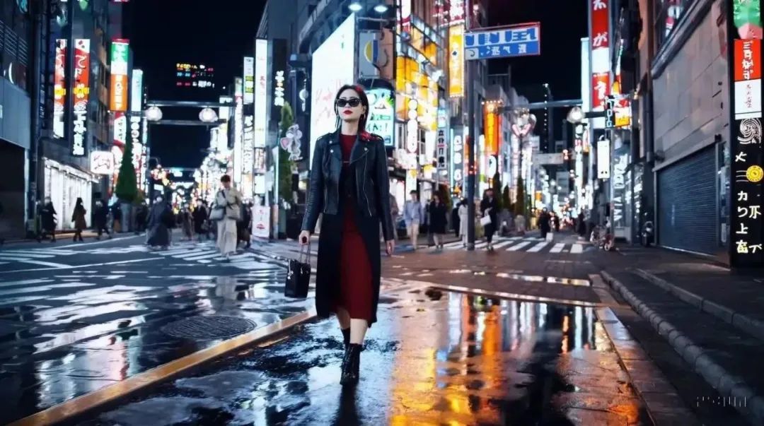 如:文本提示:一位时尚的女人走在东京的街道上,街道上到处都是温暖的发光霓虹灯和动画城市标志。她身穿黑色皮夹克,红色长裙,黑色靴子,背着一个黑色钱包。她戴着墨镜,涂着红色口红。她自信而随意地走路。街道潮湿而反光,营造出五颜六色的灯光的镜面效果。许多行人四处走动。