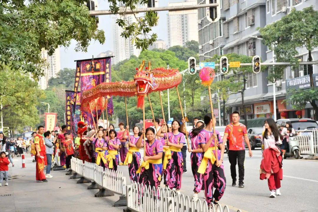 来自黄埔区萝岗街道各社区以及黄埔区内外的醒狮、龙狮、貔貅、舞春牛、曲艺等17支非遗队伍各具特色、各展其能。队伍从萝岗街文化广场出发,沿着荔红路、公路街等重点路段轮番上阵、倾情演出,为街坊们送上新春的吉祥祝福,赢得沿途街坊们的阵阵掌声。