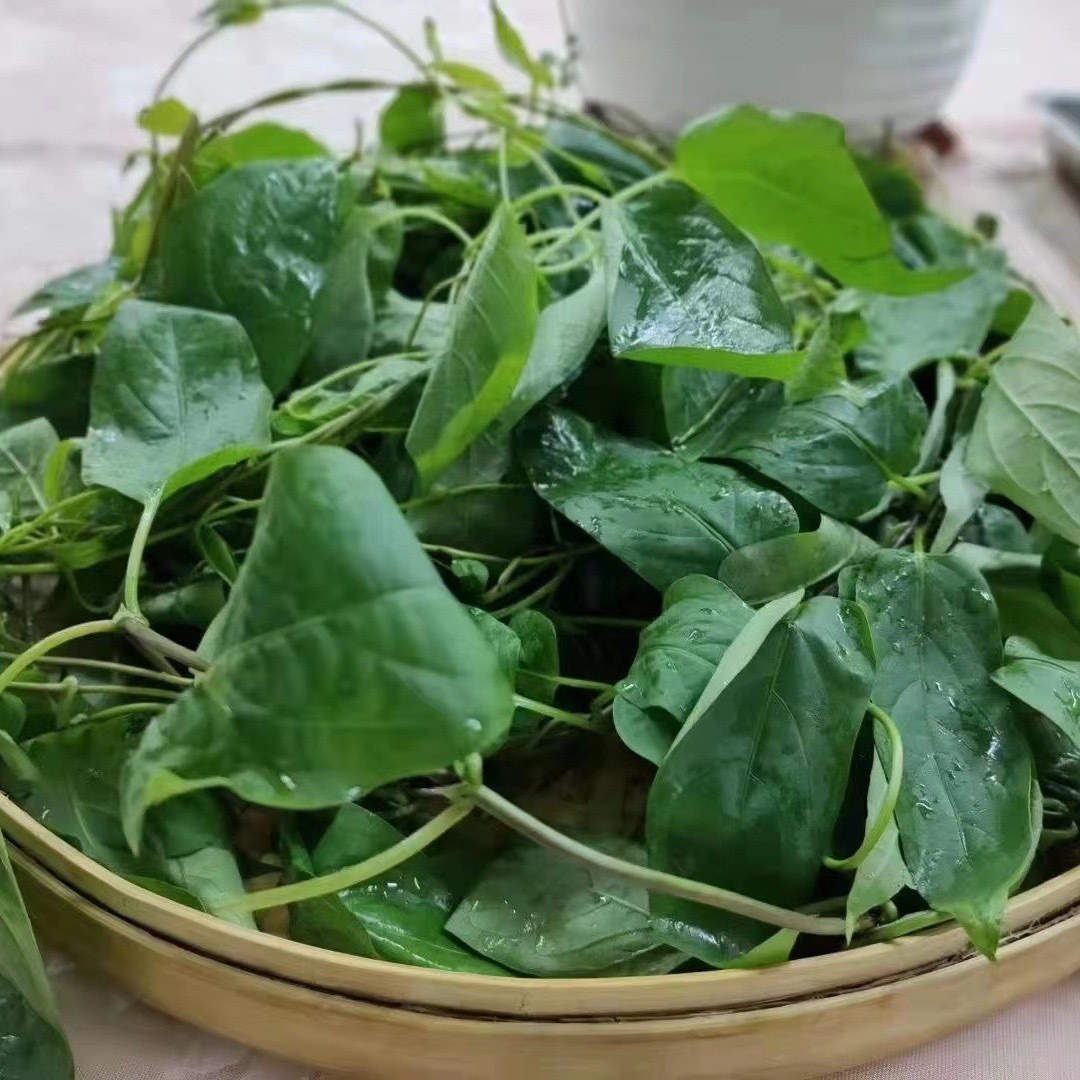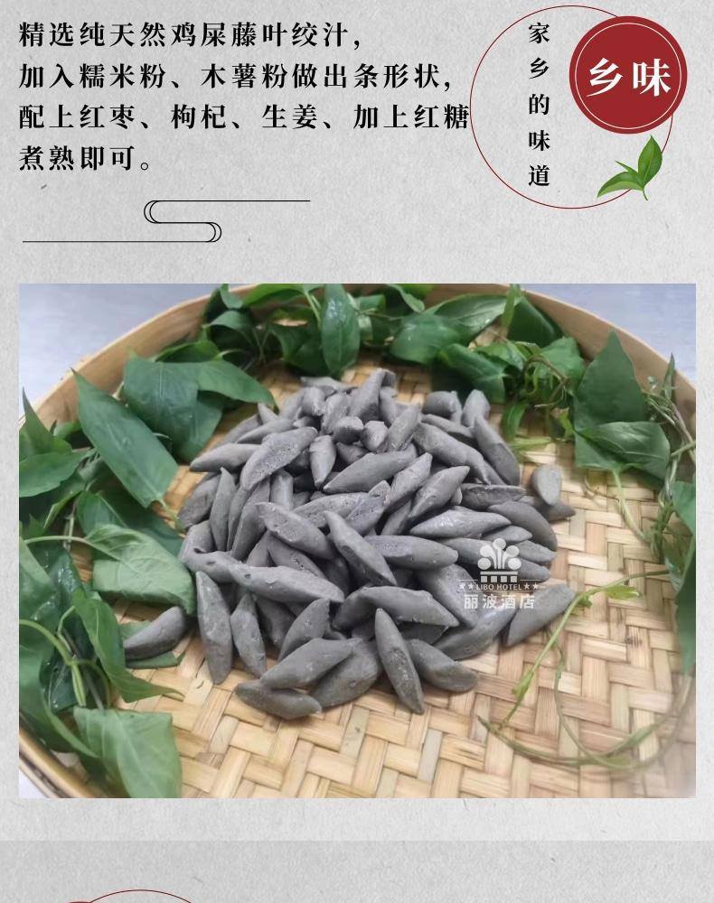 竹筐里一簇簇嫩绿欲滴的鸡屎藤(又称:鸡矢藤)茎叶,洗净后放入绞汁机里,墨绿色的汁液随着浓烈气味流入钵内,和入木薯粉和糯米粉,充分揉搓后制成小指粗的圆条,再切成小段䊦仔。在煮开的红糖水中,先后加入红枣肉、鸡屎藤䊦仔、杞子,煮好盛碗后,便是当地大名鼎鼎的鸡屎藤糖水䊦。