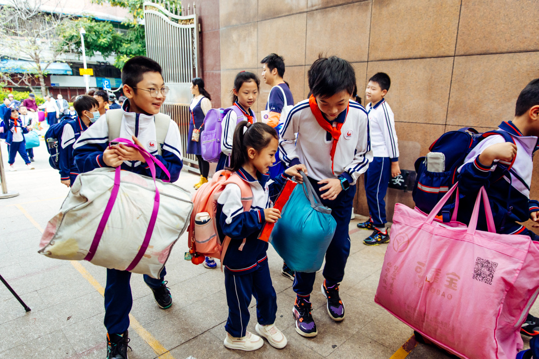 高年级同学帮低年级学弟学妹搬运午休被褥。