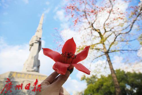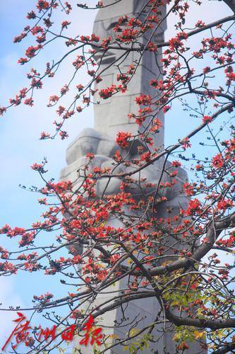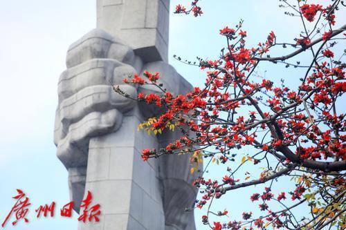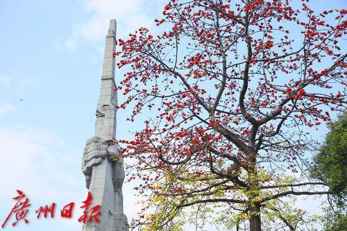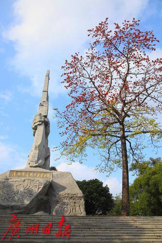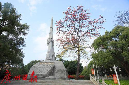 广州起义纪念碑位于广州烈士陵园内,高45米,纪念碑左侧有一棵高大的木棉树。每年2-3月,木棉树都会绽放出火红的花朵,为英烈献上最高的礼赞。