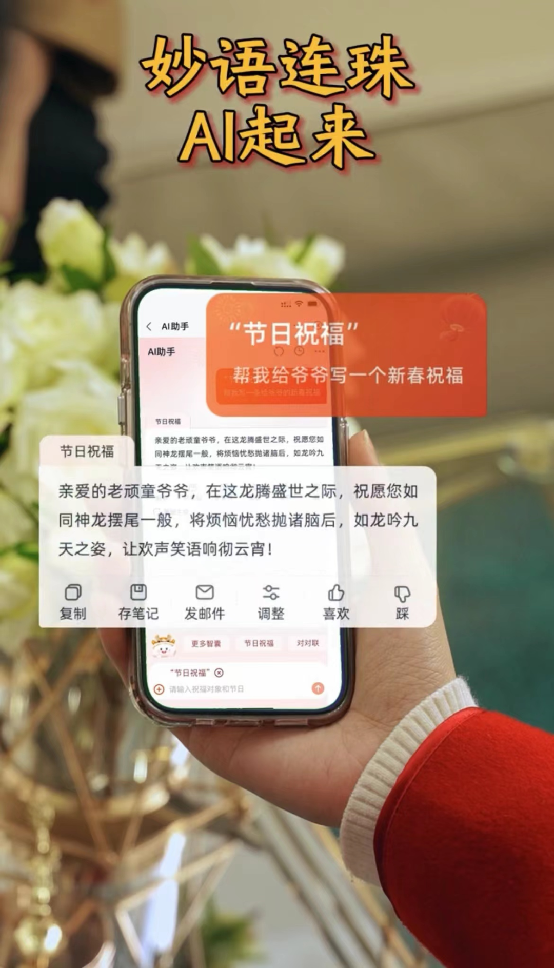2024新春期间,“数字达人”绝不会错过中国移动云盘AI体验。今年大一的可欣,每年春节的例牌活动是逛广州越秀花市。她不停拍摄花市里的花团锦簇的美丽图片及年俗片段,打算分享给异地过年的老师同学们。她熟练地打开移动云盘APP,先给自己换个卡通“新头像”。想送出别具一格的祝福?“AI写祝福”功能作为线上“智囊团”,片刻之间就提供不同风格的祝福语供选择。她选定心仪的祝福语,再配上即拍即传的温馨图片,具有鲜明“南粤风情”的温馨祝福即刻传递到五湖四海的亲友身边。新春佳节期间,中国移动云盘“一键修复老照片”、“即摄即共享”、“人像识别搜索”等功能也被广泛使用。