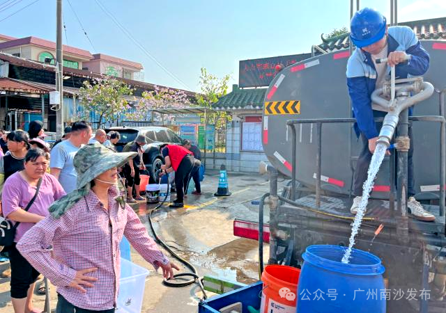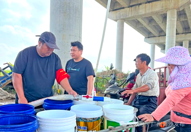 小南从广州南沙粤海水务有限公司获悉,为保障三民岛居民用水,当天上午该公司经协调,临时将送水车开至目前暂未开通使用的南中高速路面,通过供水软管往下输水,桥下由村委工作人员用储水罐接水后进行统一分配,满足居民应急用水需求。