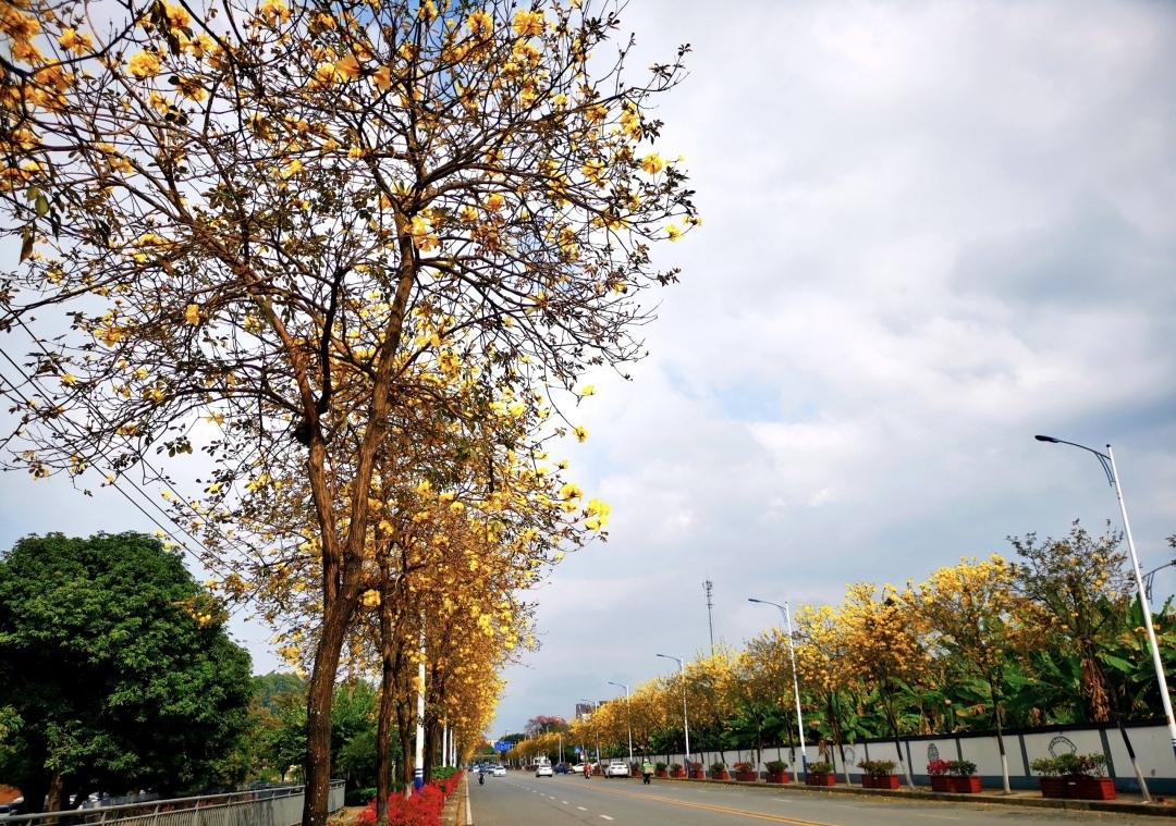 在沙湾街福龙路,道路两旁的黄花风铃木也陆续开花了,从渡头村路段到沙湾珠宝产业园路段形成约2公里长的金色景观带。微风吹来,一串串金黄色的花朵在枝条摇曳。
