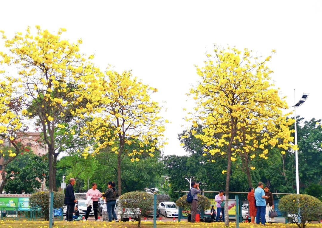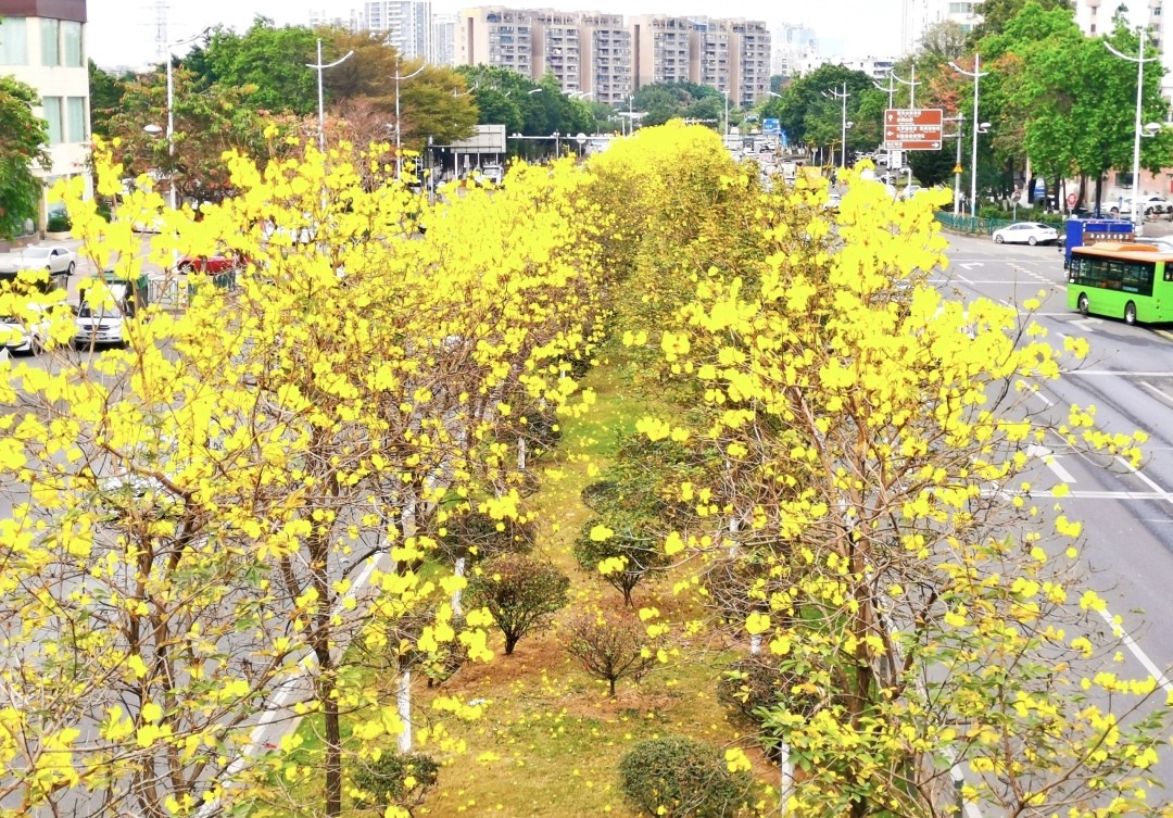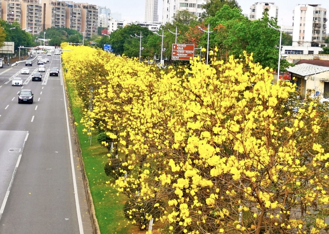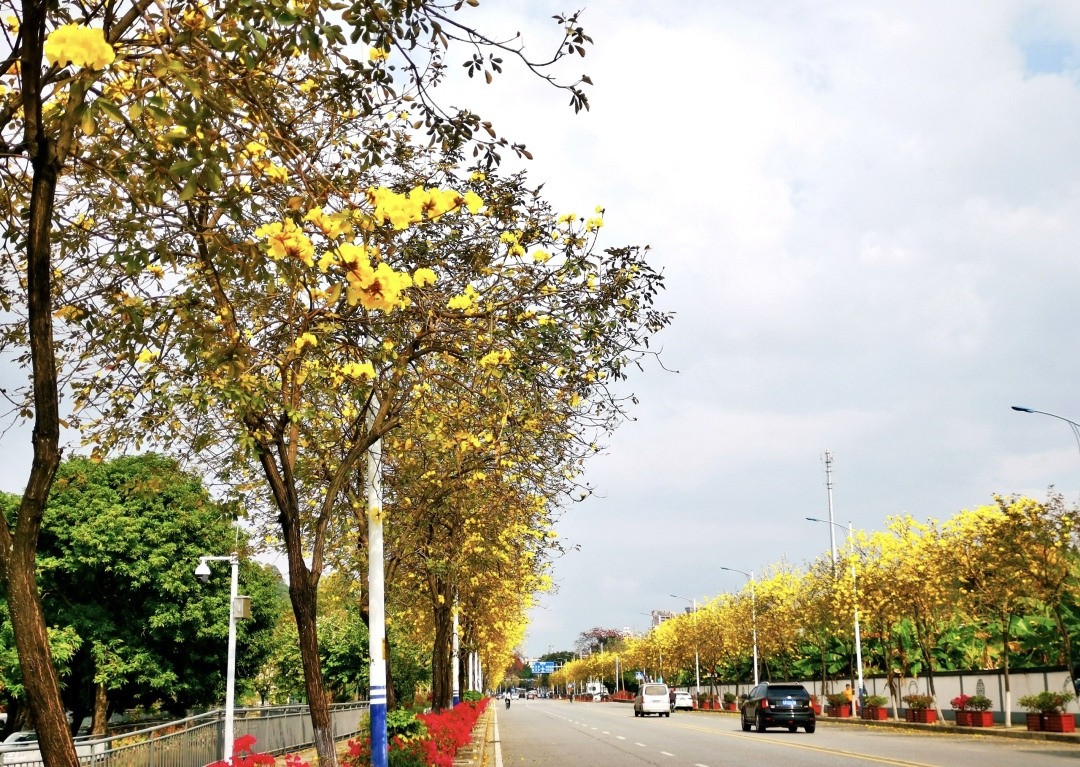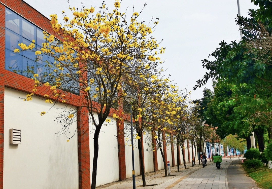 早春番禺,绿意盎然,生机勃发。近日,广州市番禺区街坊留意到,路边一株株黄花风铃木陆续开花了,黄灿灿的花朵挂在枝条,将番禺的春天装扮得更加美丽。