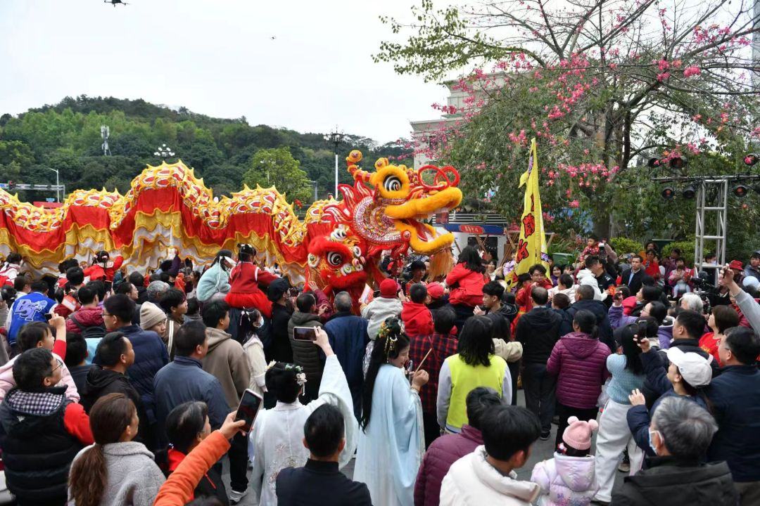 活动一开始,长岭龙狮协会的龙狮队开展巡游,活泼可爱的狮队和26.8米的“巨龙”游街串巷,吸引了大批“粉丝”驻足合影,大家都纷纷摸摸狮头、龙头,讨个新年“好彩头”。