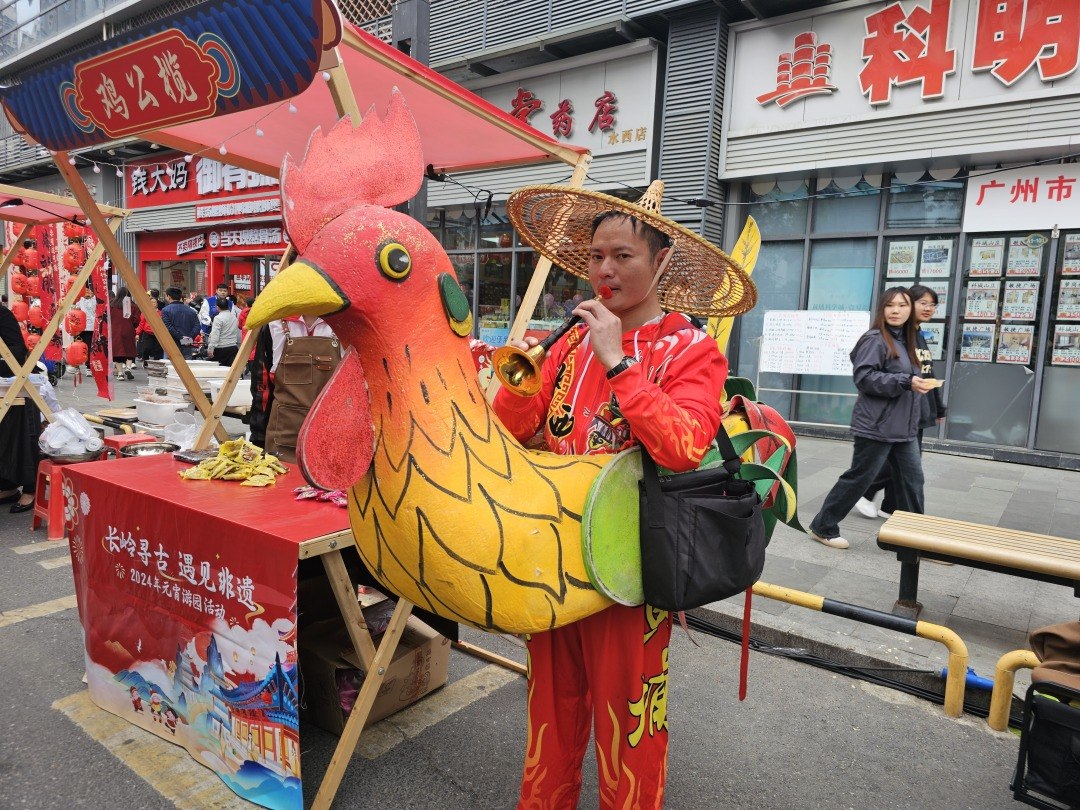 “鸡公榄,有辣有不辣”,随着一声吆喝,身着彩色公鸡模型的人缓缓从大街上走来,只见他用一条过肩带把彩鸡提起来,边走边吹唢呐模拟公鸡的叫声,吸引顾客,这画面瞬间把广州本土小伙伴拉回儿时的记忆中,“鸡公榄”是广州本土的特色文化,勾起了无数街坊对无忧无虑的孩提时光的幸福回忆。