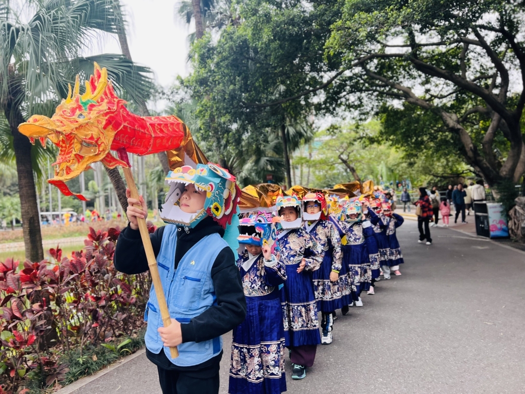 亲手制作“万事兴龙”纸头套后,戴着手工龙头的孩子们和家长默契配合,舞动龙身,在龙头的引领下展示扭、挥、仰等多种姿势,吸引不少游客驻足观看。金黄色的龙身翻飞起舞,寓意着新年的吉祥和繁荣。