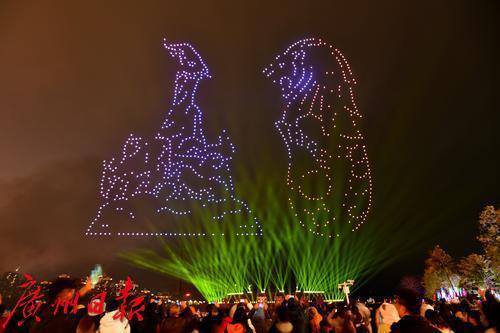 2月24日晚,九龙湖上空有8万发焰火伴随音乐盛放在夜空。九龙湖湖心岛及湖面布置了超70个燃放点,1000架无人机腾空,交织而成长900米、宽280米的斑斓画卷。