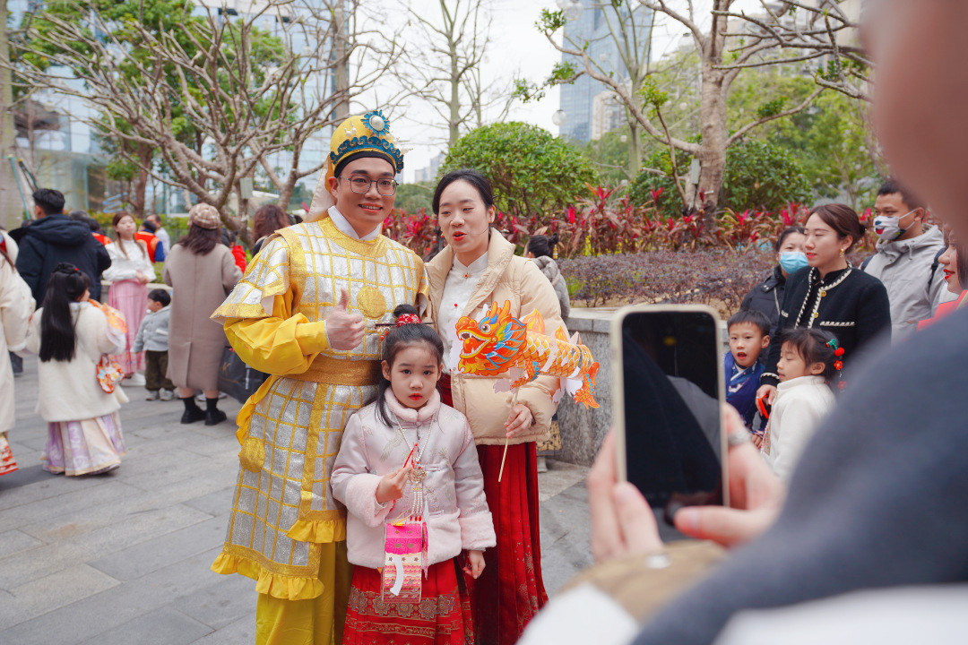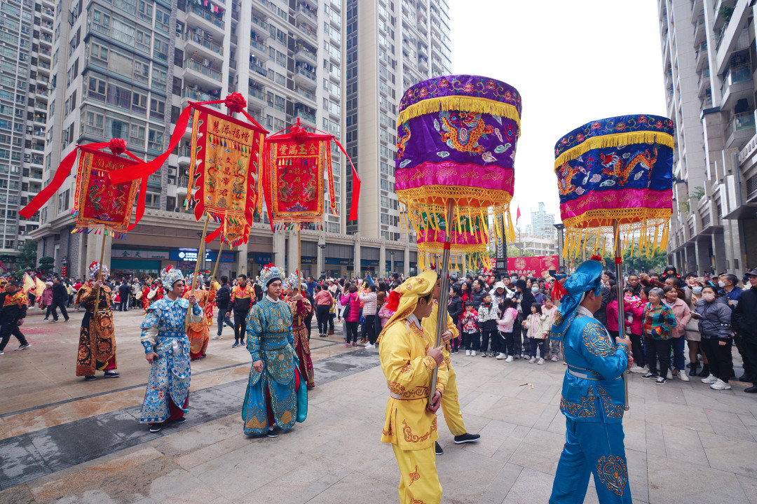 上午9点,大型特色巡游正式开始。巡游依托猎德岭南水乡特色、“菩萨行乡”传统民俗,以传统神话故事人物、水乡风情、狮跃龙腾等部分组成巡游队伍。巡游队伍中,“八仙出巡”“财神送福”的方阵祝福祖国风调雨顺、国泰民安;“龙凤呈祥”“猎德鼓”“华服之美”的方阵展现猎德人同心同德的团结精神。此外,还有狮跃龙腾,笑佛恭贺,引来市民围观拍摄。据悉,此次巡游包括6个方阵,参加巡游的演员近300人。