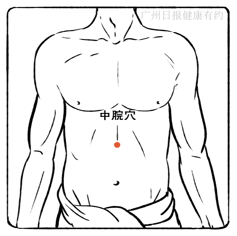 中脘穴位于上腹部,在前正中线上,胸骨下端和肚脐连接线中点即为此穴,按摩中脘穴有和胃健脾的作用。