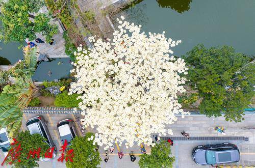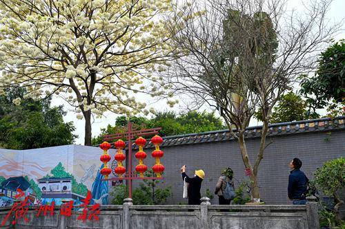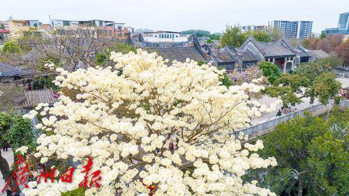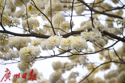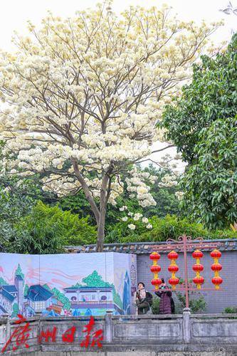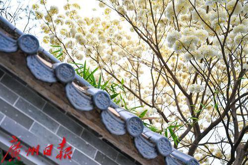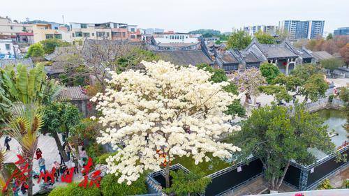 黄花风铃木见得多,但白花风铃木你见过吗?纯白如雪的白花风铃木,可以说是广东四大名园之一的余荫山房春日一道靓丽的风景线。 近日,在余荫山房景区,一株白花风铃木正惊艳绽放,花儿密密麻麻,大朵大朵簇拥于枝头,向人们送上早春的问候。