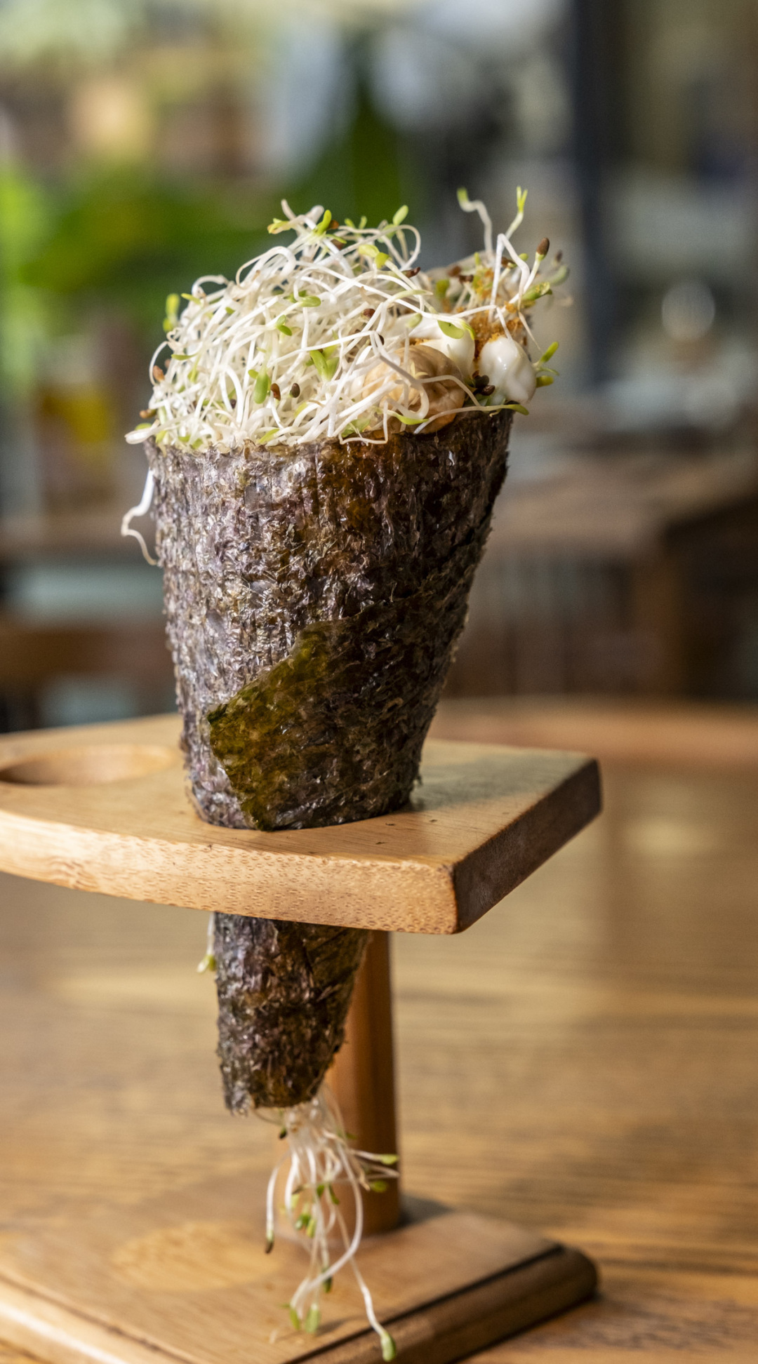 超哥店内的露天院子草木丰郁,阳伞下的餐桌上摆着几箱正在发芽的苜蓿。店内有一道招牌菜叫作“苜蓿芽手卷”,用的就是店里的苜蓿。苜蓿是豆科植物,苜蓿芽外表和豆芽相似,不过要比豆芽细得多。超哥介绍,春天正是适合吃芽菜的季节,而苜蓿相对于豆芽而言腥味稍淡,吃起来更加爽口。这道菜用紫菜把苜蓿芽、素肉松、腰果、胡萝卜、黄瓜等卷起来,淋上沙拉酱一起吃,酱汁中和了苜蓿芽的豆腥味,因为使用的是生苜蓿芽,清新的味道格外强烈,一口下去就有春天来了的感觉。